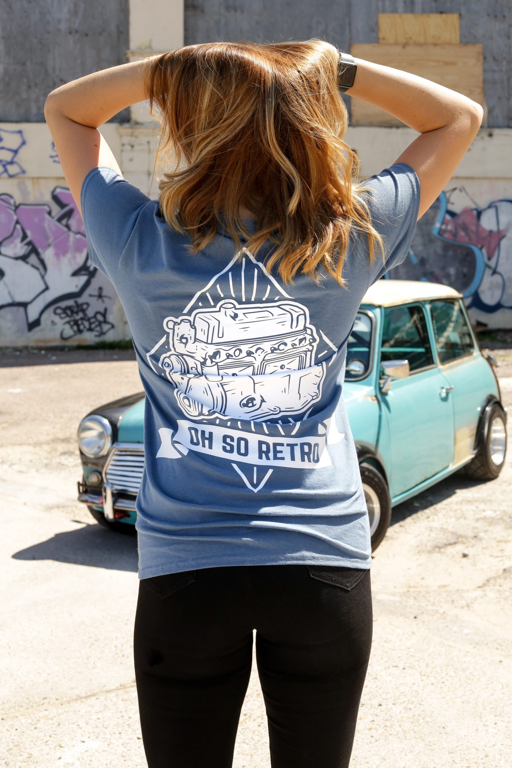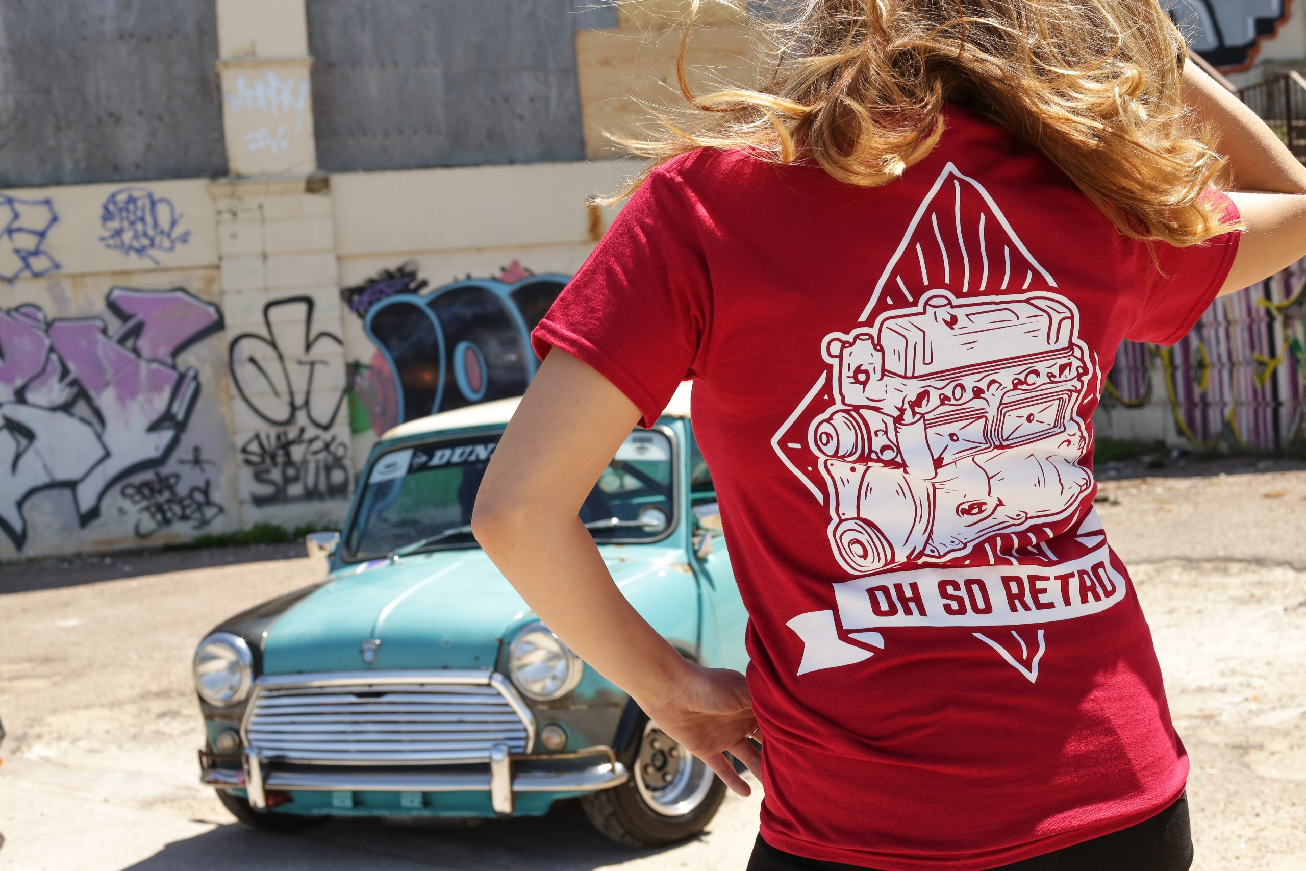Rear oversized A Series Engine design and front OhSoRetro banner.