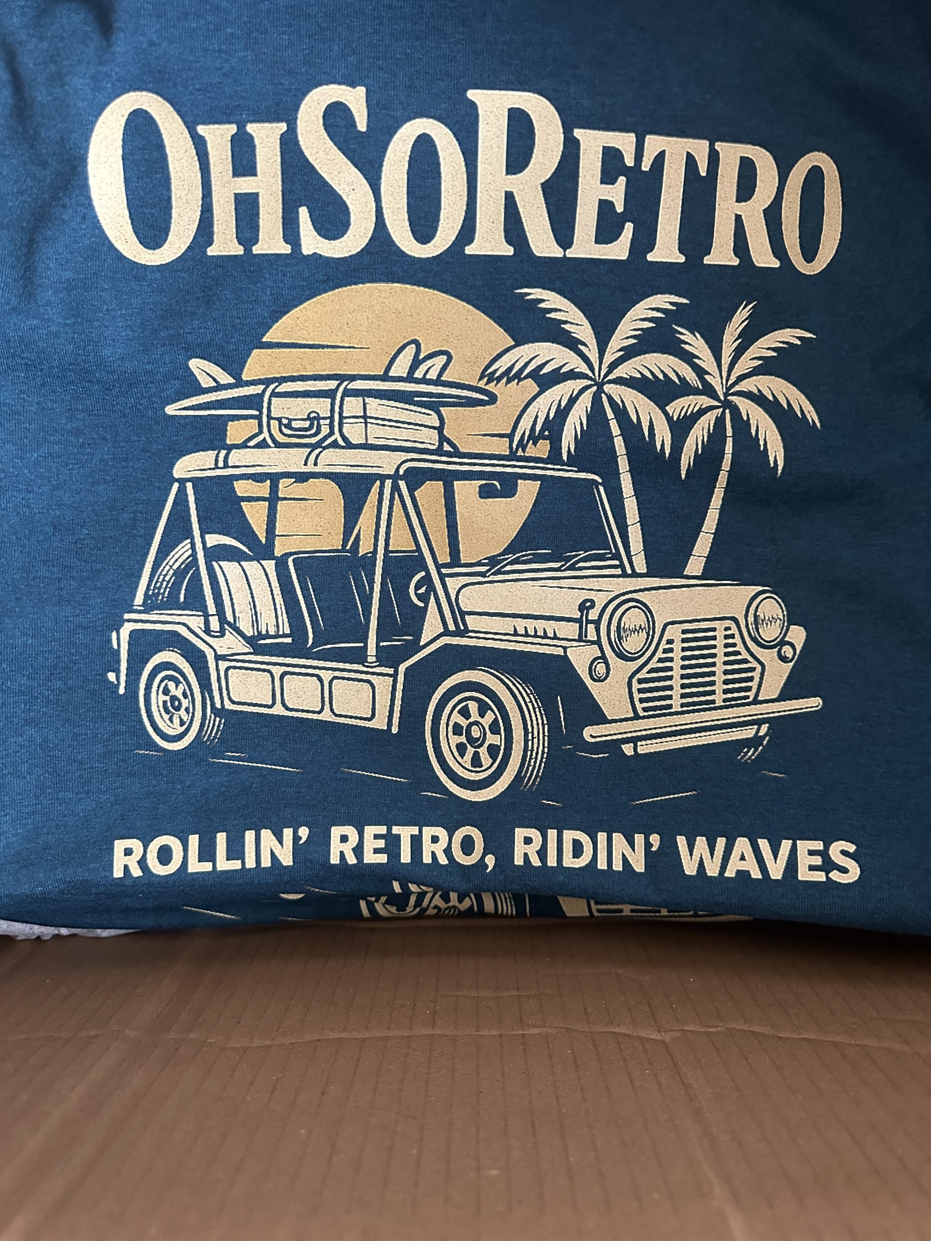 Printed in the UK onto Blue Tshirts with custom #OhSoRetro neck print.